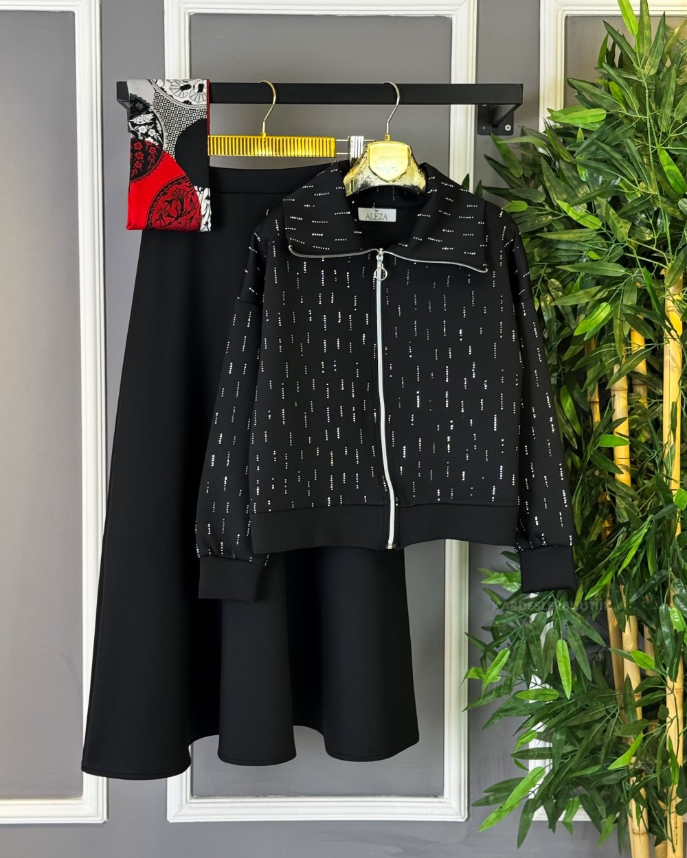 Taşlı Etekli Takım Siyah