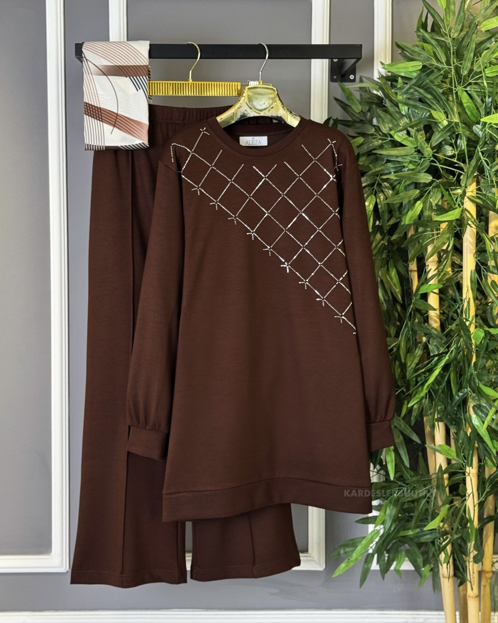 Tunik Yandan İşlemeli İkili Takım Kahverengi
